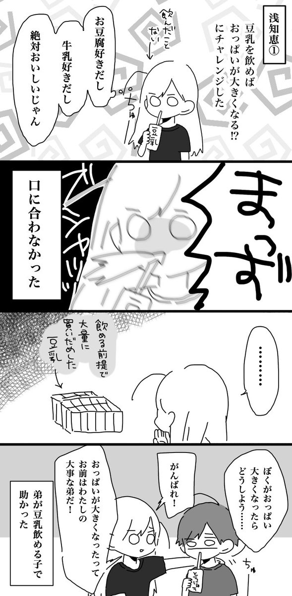 たふぃ 姉 生理前に無調整豆乳飲むと痩せるって話を聞いて飲んだんだよ 俺 ほうまた迷信に踊らされたか 姉 痩せなかった だけどな 俺 どうした太ったか 姉 胸がデカくなった 俺 生理前の無調整豆乳は効くらしい